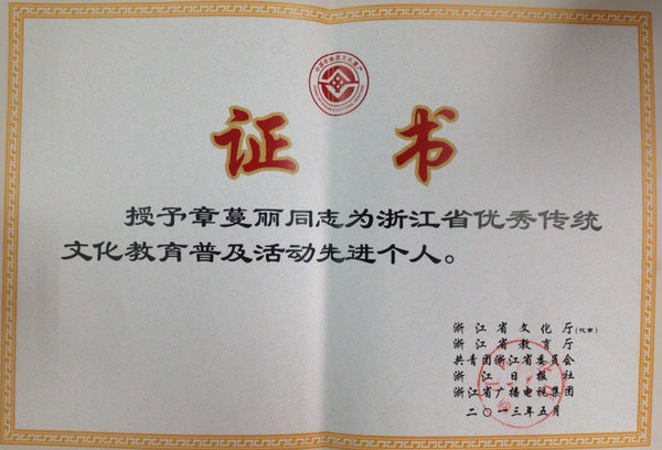 作为省首批高校“非遗研究基地”和“非遗教学传承基地”,浙艺院在弘扬中华优秀传统文化中,始终立足高职特点、学院特色,以非物质文化遗产传承为重点,在非遗普及教育方面做了大量工作。除结合教学特色,开展传统文化教育普及活动,充分发挥艺术教育在非物质文化遗产传承发展中的重要基础性作用外,还由非遗研究基地建立“非物质文化遗产资料室”;多方采集资料,用于传统文化的教育普及和研究工作。这些传统文化教育普及的基础工作,对深化具有高校性质的非遗教育普及成果产生了成效,浙艺院师生在各级非遗相关的文艺与学术交流中佳绩频传。如先进个人称号获得者章蔓丽,她一方面在日常教学中致力于将“越剧”、“太湖渔歌”等“非遗”曲目带进课堂,另一方面通过大学生暑期社会实践的平台,带领团员青年多次深入浙江省非遗特色村——庆元县月山村,通过支教、宣传、调研、艺术品捐赠、与当地村民同台演出等形式,将课堂所学灵活运用于实践,2012年参加的“月山春晚”还得到了国家、省、市各级媒体的高度关注。