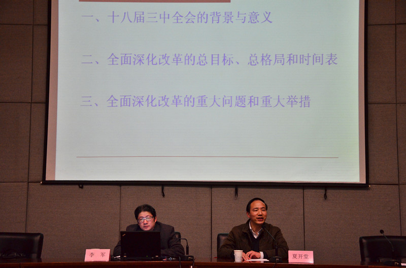 开班仪式后,学院邀请省委教育工委讲师团成员、浙江传媒学院副院长、党委委员李军教授作《“十八届三中全会”精神解读》专题讲座。他从十八届三中全会的背景与意义,全面深化改革的总目标、总格局和时间表,全面深化改革的重大问题和重大举措三方面入手,阐述十八届三中全会的精髓。李军的讲座主题鲜明、结构清晰、重点突出,语言生动,结合大量案例和实际问题,既有理论的深度,又有个人的独特见解,赢得在座干部教师的一致好评。