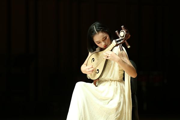 当天下午,不期而至的暴雨犹如展演的前奏,嘈嘈切切,与各个排练厅传出的乐声相应和。我院附中高二学生龚力娅在指导老师祝杭红带领下也在排练厅为下午演出作准备,她的柳琴独奏在第三场。《澳门狂想曲》是她打磨了一个学期的乐曲,技巧复杂,需要很高的音乐表现力。柳琴在民乐弹拨乐器中属高音乐器,音响效果独特,龚力娅已习练6年。她在台上时而轻拢慢捻抹复挑",时而嘈嘈切切错杂弹",声音低处几不可闻,高处如骤雨激荡,一曲终了掌声雷动。