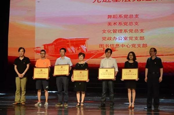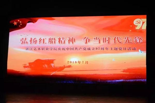 党日活动之红色文艺作品汇演,集中展示了学校近年来在艺术创作中涌现的主旋律艺术作品,由“历史记忆”、“时代新声”、“起航未来”3个篇章组成。戏剧系党总支选送,将越剧融入现代元素的《江姐·热血染红满天云》,反映了共产党人在生命危急关头,用实际行动践行对信仰的追求和坚守的原创小品《别》;音乐系党总支选送,歌颂抗日战争时期民族英雄的板胡独奏《地道战》,表达共产党人的初心和使命的男女声二重唱《不忘初心》,歌颂中华民族迎来从站起来、富起来到强起来的伟大飞跃,迎来了实现中华民族伟大复兴的合唱《中国进入新时代》;舞蹈系选送,作为浙江唯一一个群舞类节目入选全国第十二届舞蹈展演的《红船》;美术系党总支选送,表达少年中国梦的原创动画《听,五星红旗在飘扬》;影视技术系党总支选送,为我校思政教育基地遂昌王村口镇拍摄的微视频合集《红色古镇王村口》;文化管理系党总支选送,讴歌党的十九大的原创快板《歌颂十九大》;基础教学部党总支选送,由全校9位党总支书记共同朗诵的原创作品《红船颂》,意境深远、情真意切、感人肺腑,将党日活动的气氛推向高潮。