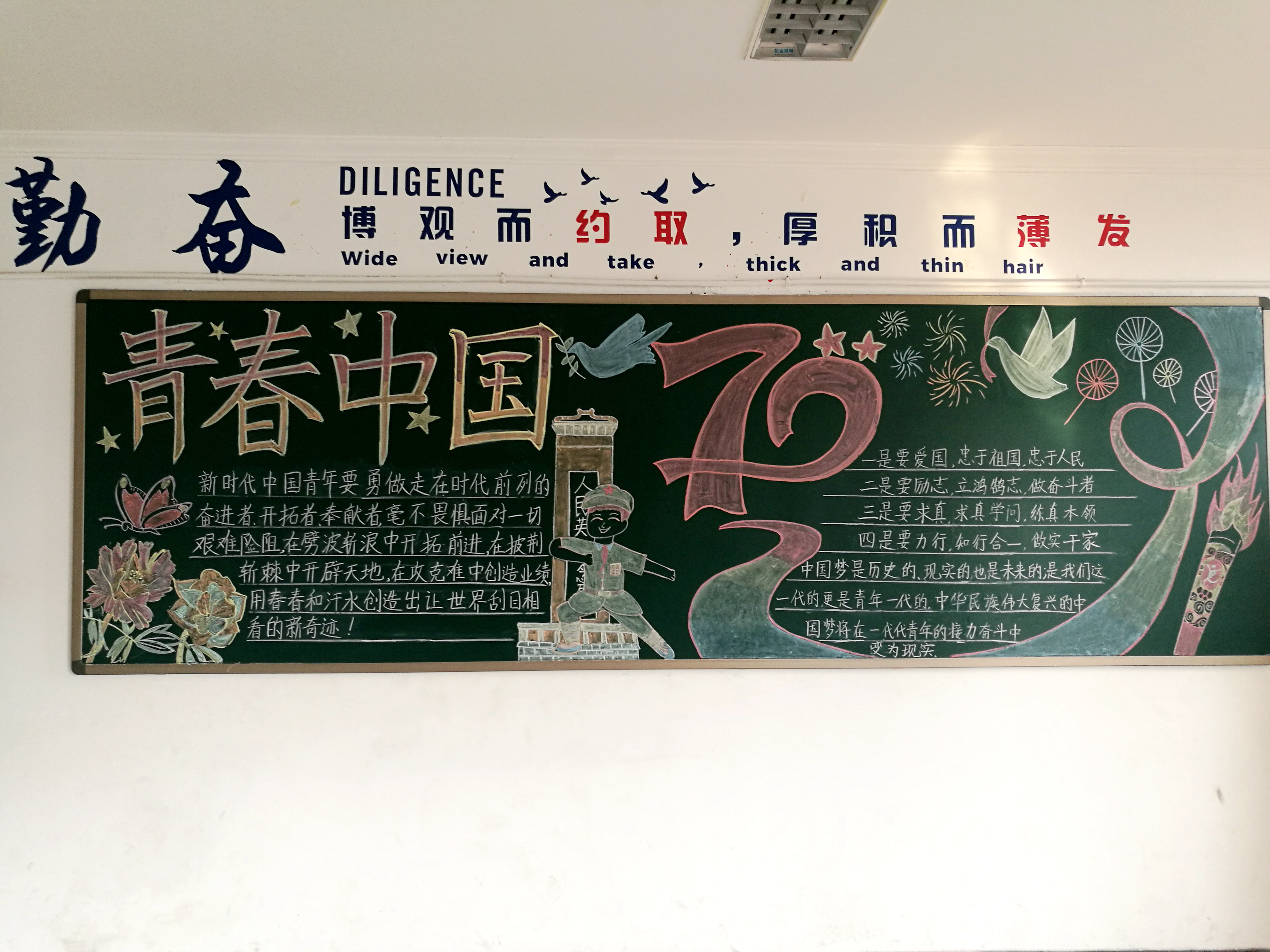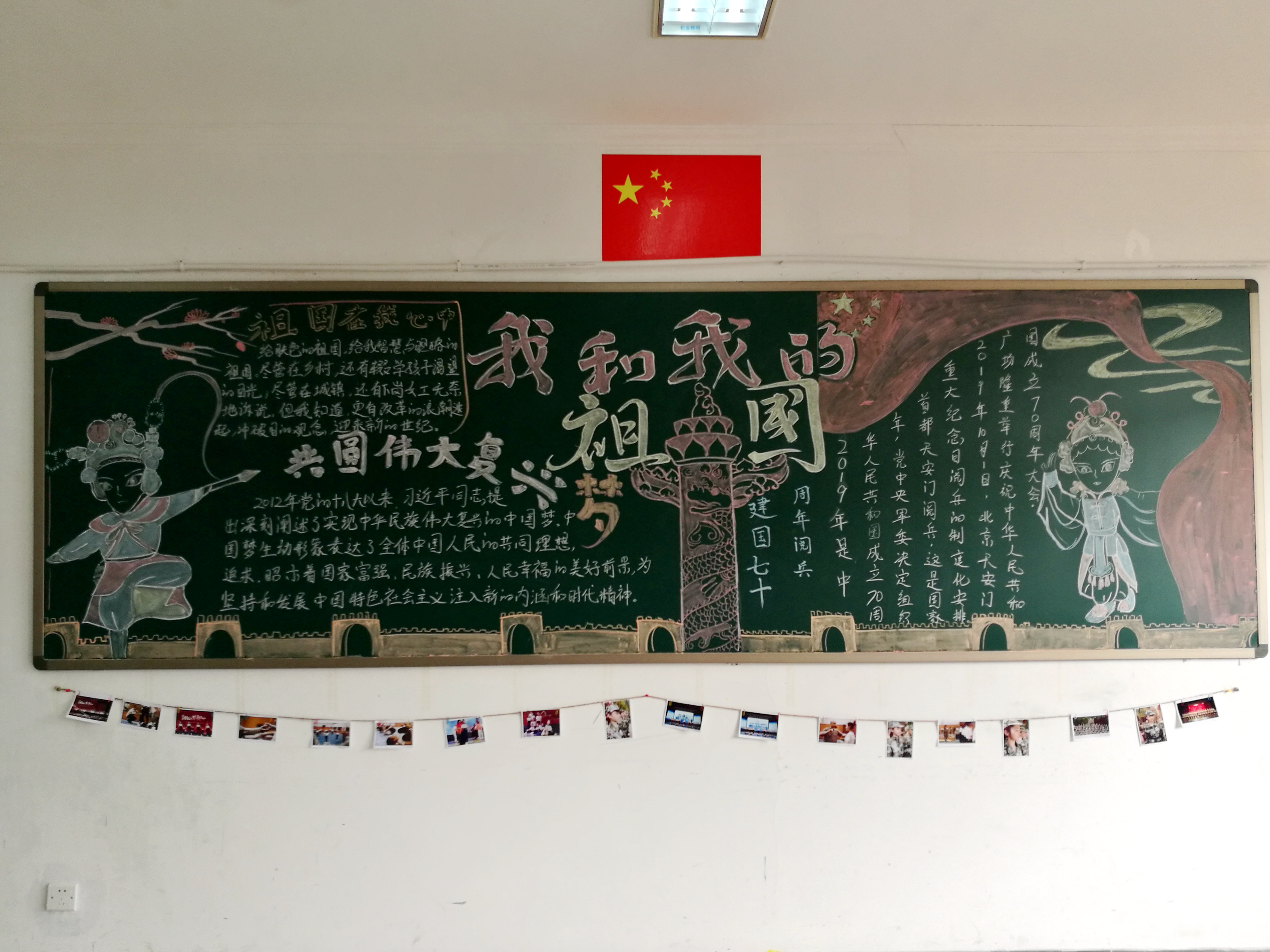 通过教室美化大赛,让学生主动了解祖国走过的70年光辉历程,认识到一代代中国人为了中华民族伟大复兴的中国梦薪火相传、艰苦奋斗,激发了学生的爱国之情和学习热情。同时,让学生意识到“天下兴亡,匹夫有责”的责任感,夯实基础、奋力求学,为实现富强民主文明和谐美丽的社会主义现代化强国而努力奋斗。
