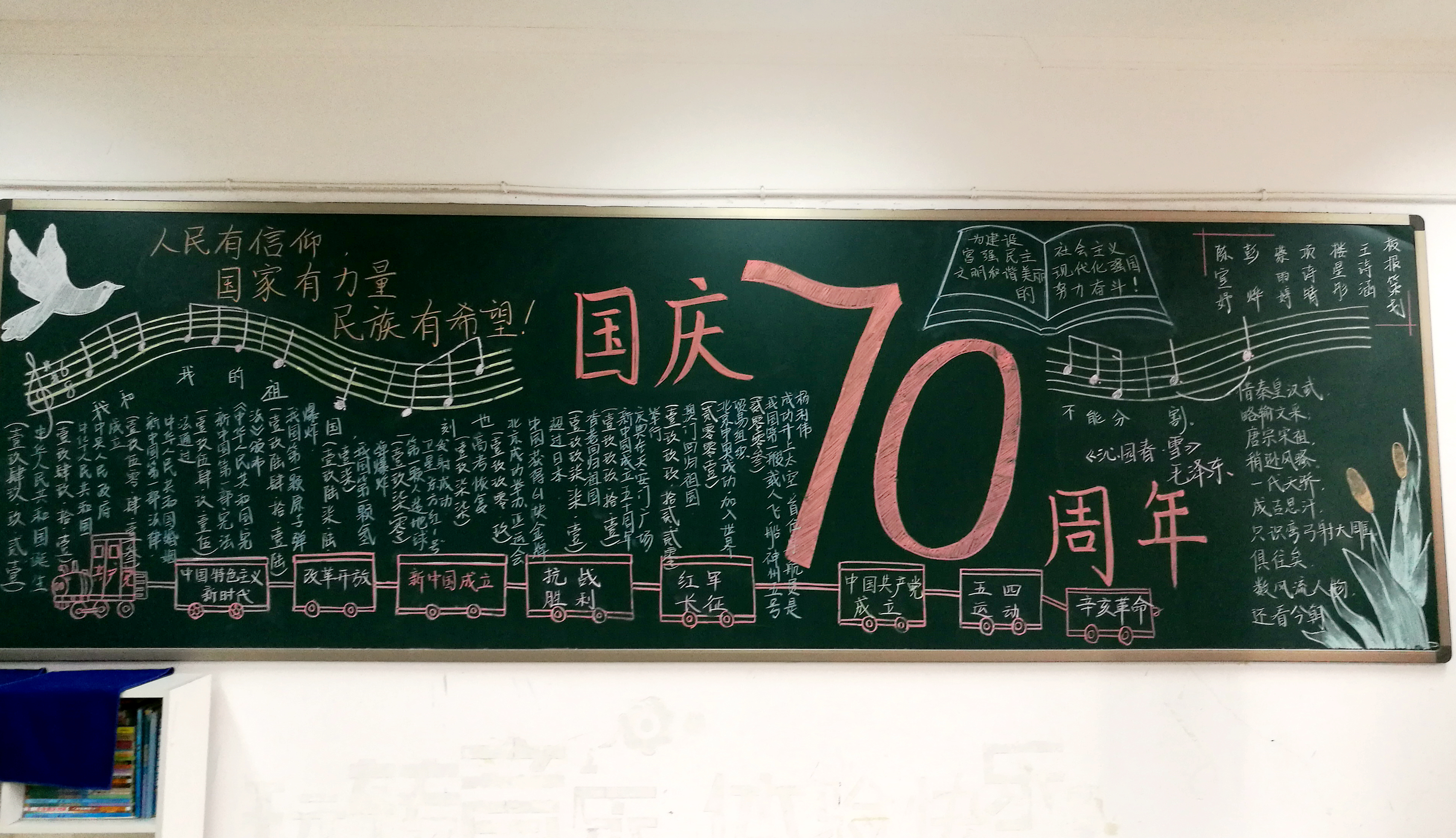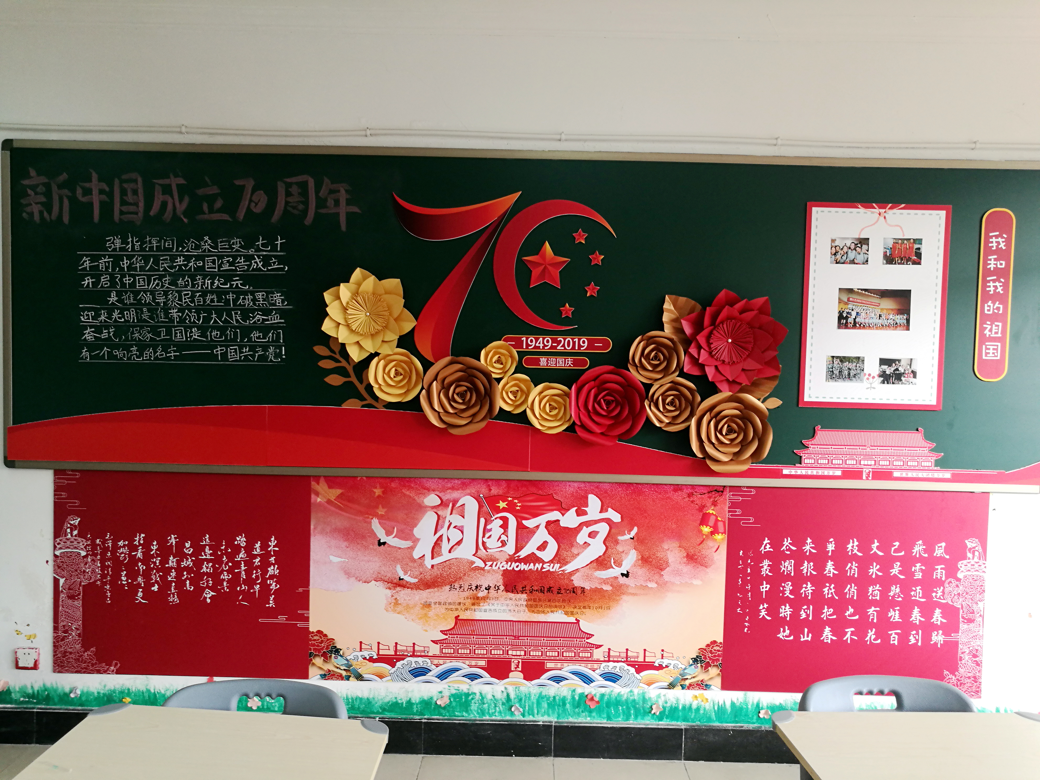 本次教室美化大赛从9月初启动,18个班级的学生们在班主任的细心指导下,查阅资料,精心设计,通过诗歌、图片、文章、音乐等各种形式,表达了对祖国母亲的美好祝愿。
