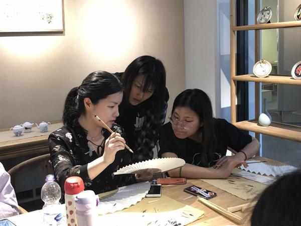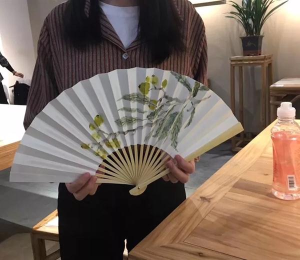 课上,游晓婷为同学们讲解了杭扇的制作流程、注意事项与扇面绘画技巧。赵平加拿出了工作室的扇绘作品启发同学们的灵感。两位老师根据学生所用花鸟和山水画临本的不同,进行了逐一的悉心指导。学生们学习和体验了穿面、扇面绘画等杭扇工艺制作流程,一笔一画,精雕细琢。