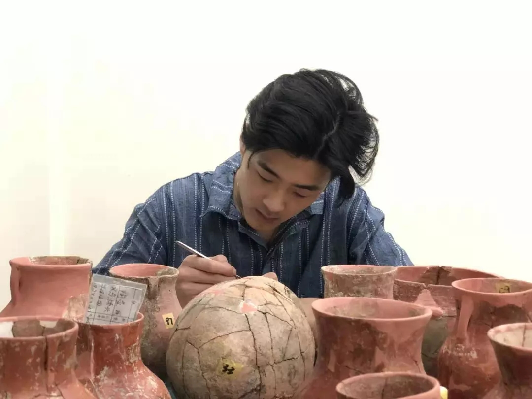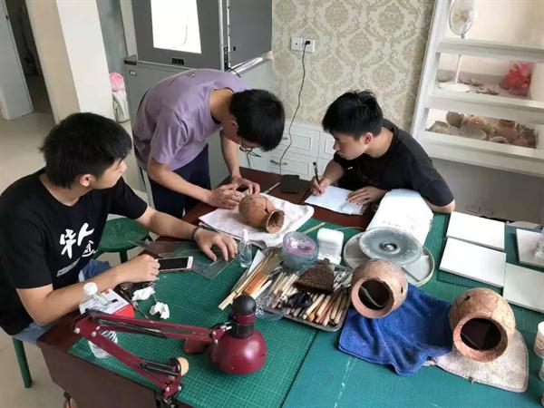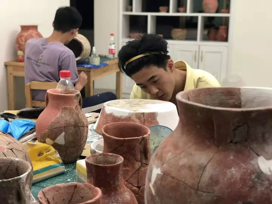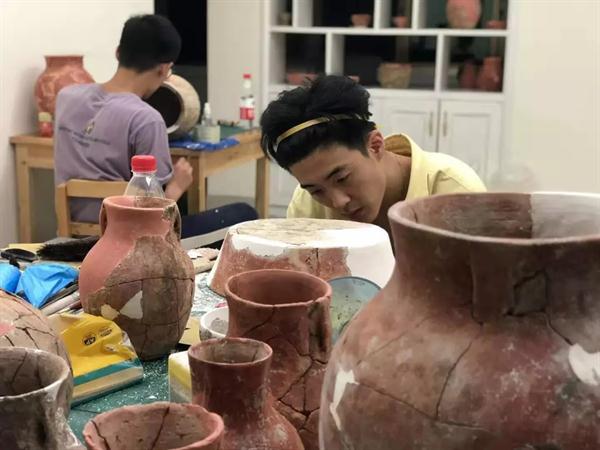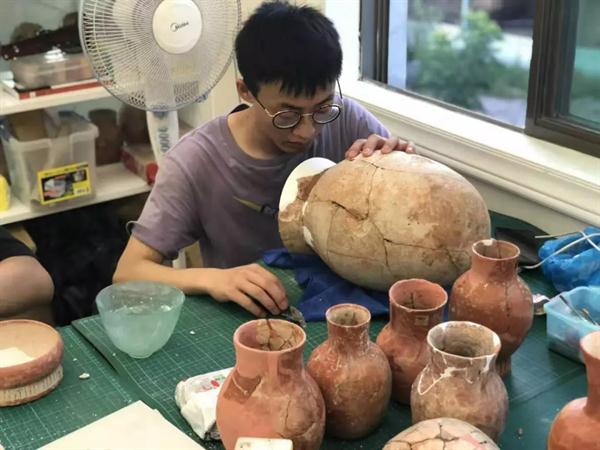 遗址的探方中随处散落着碎陶片,文物修复师生的工作就是将成百上千的碎片通过修复方案的确定,经拍照、档案记录、清理、拼接、补缺等修复工序,把碎片复原成器。众所周知,考古工作条件十分艰苦,修复的工地里没有空调,只有电风扇,正是文物修复师生们对专业工作的热爱与执着,才能顶着高温酷暑,放弃暑假休息和舒适的环境,投身到文物修复的重要工作中。