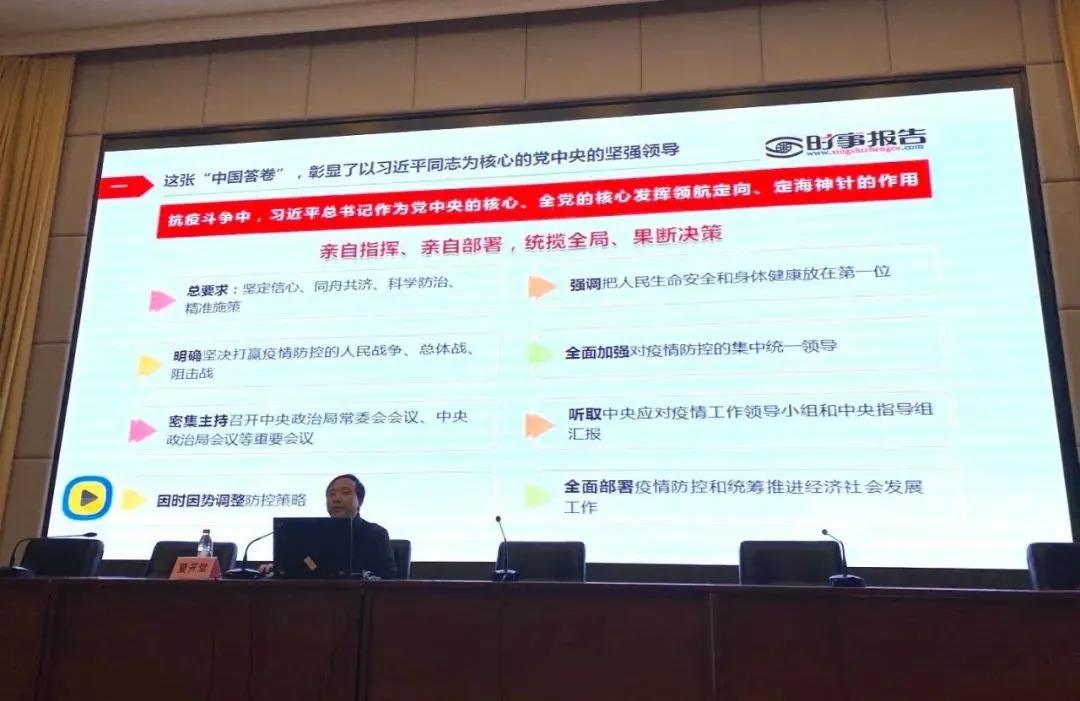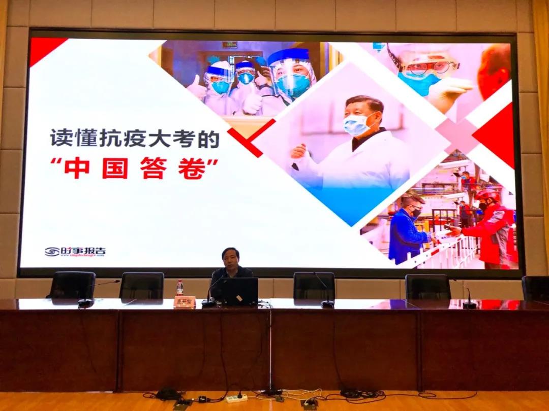 夏开堂以“读懂抗疫大考的中国答卷”为主题,用感人的事迹、简洁的图文、详实的数据生动讲述了党和国家在抗击新冠肺炎疫情中的伟大壮举,着重讲述了以习近平同志为核心的党中央的坚强领导、中国特色社会主义制度的显著优势、中国人民坚韧奉献和守望相助的民族精神、我国治理体系和治理能力的效能水平、改革开放以来积累的雄厚物质基础、践行人类命运共同体理念的大国担当六个方面内容。他指出,在未来的征程中,不管有多少艰难险阻,只要在中国共产党的坚强领导下,中国人民团结奋斗,中国的明天将无比美好,中国的未来会无比光明。希望同学们树立远大理想,努力学习,创作、演绎优秀的文艺作品,为时代立传,为人民放歌。
