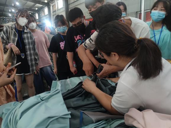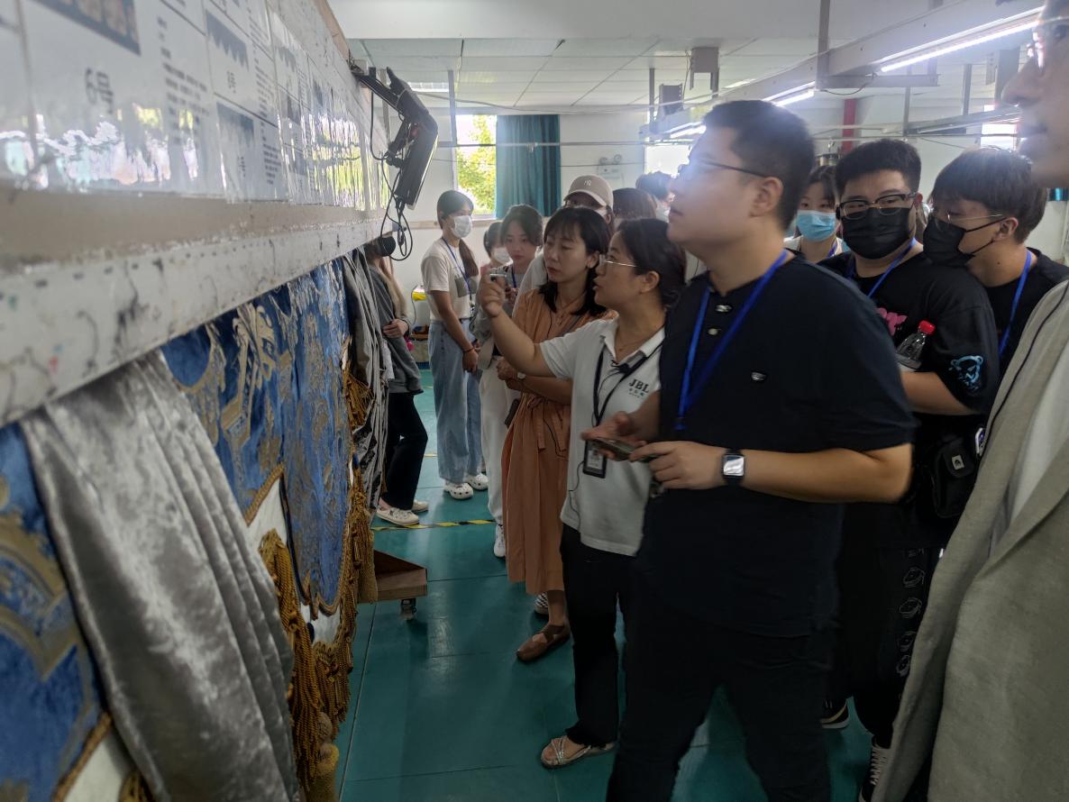 企业生产经理为同学们讲解织造、绣花、印染、涂层等工艺流程。听着巨大的机器发出震耳的声音,看着忙碌的工人穿梭在工厂内。同学们第一次近距离地参观窗帘的制作,同时了解到窗帘的制作工艺。