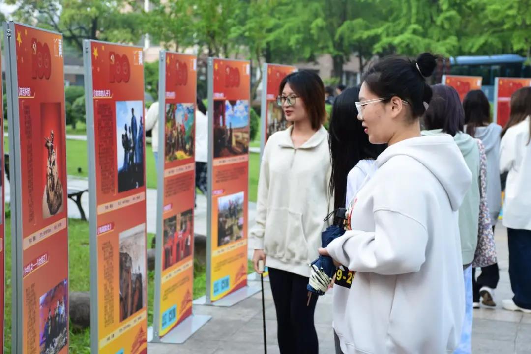升旗仪式结束后,同学们观摩“美术经典作品中的党史”微展览。
