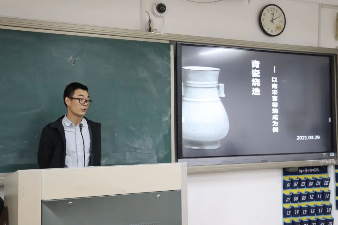 民族传统技艺专业教研室教师郑源雷主讲《青瓷烧造——以南宋官窑烧为例》,他从南宋官窑的历史、元素构成、烧造工艺、作品展示及与其他窑口的关系等,详细展示了南宋官窑的烧造技艺。