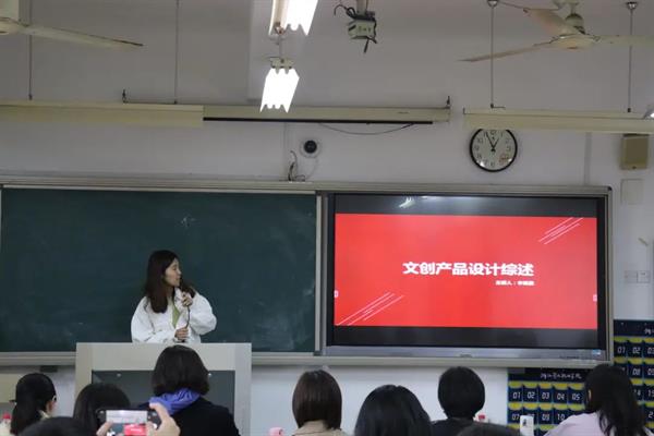 文化创意与策划专业教研室教师李旭晨讲授的主题是《文创产品设计综述》,她从文创的定义、形态、研究对象、应用、产品设计和案例分析几个方面条理清晰地讲解了“文创=文化+创意+产品”的理念。