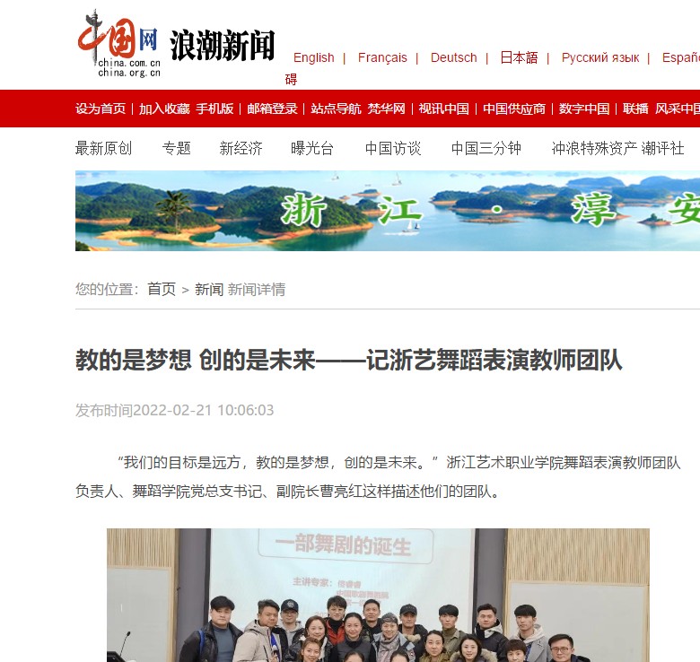中国网浪潮新闻:教的是梦想 创的是未来——记浙艺舞蹈表演教师团队