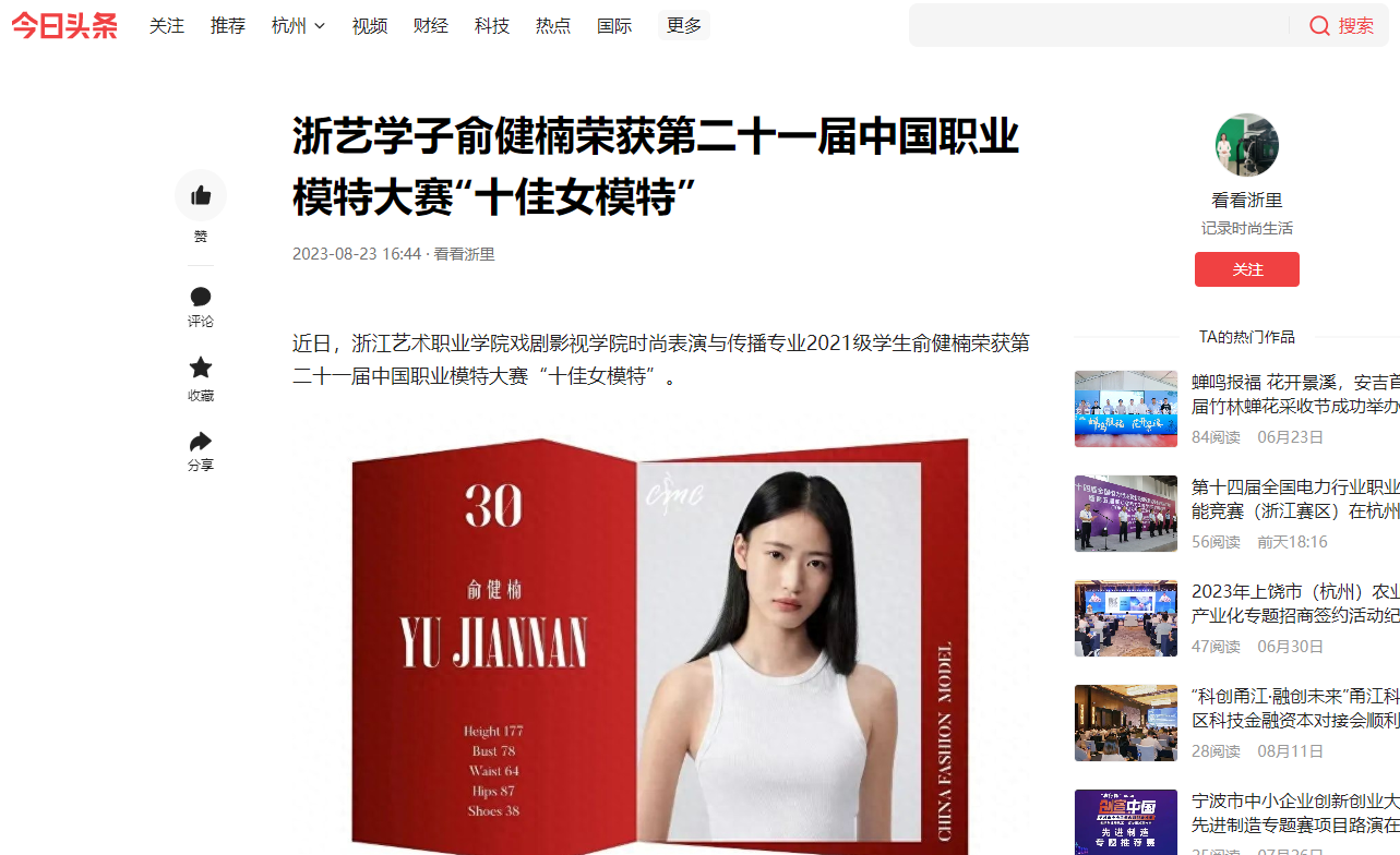今日头条:浙艺学子俞健楠荣获第二十一届中国职业模特大赛“十佳女模特”