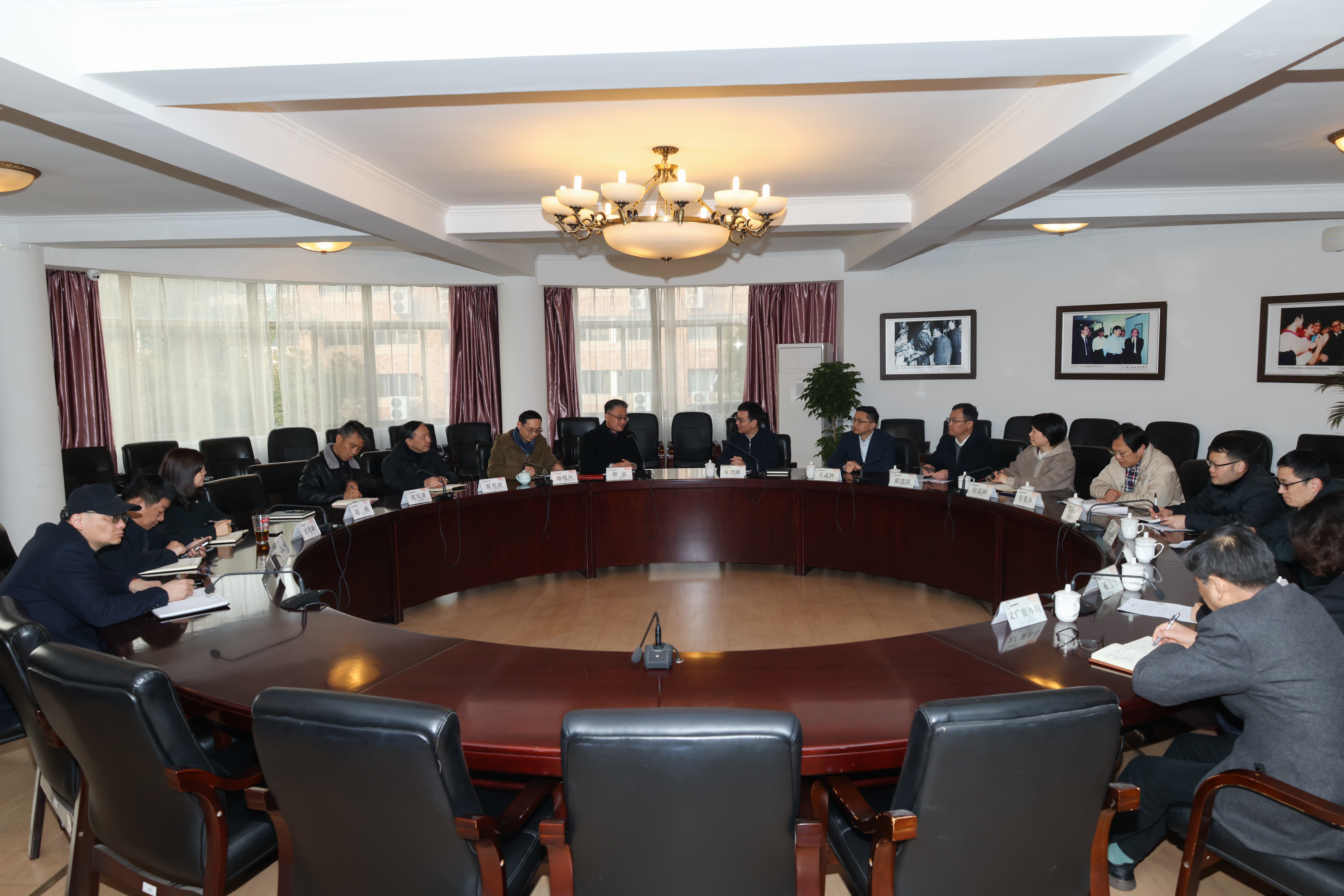章登峰一行参观了戏曲学院、舞蹈学院、手工艺学院等教学实践场所,了解新教学综合楼建设进展,并与我校党委班子成员进行座谈交流。
