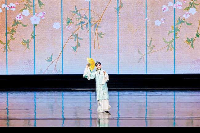 “夜空中央一缕星光,种下希望指引着方向……”结业典礼当晚,学员们以自编、自导、自演的精彩节目,全方位展示三年学习成果。演出在人才计划主题歌《星辉》中拉开帷幕,作品融合戏腔与合唱,生动展现三年培养历程。随后,陈丽俐带来的婺剧《穆桂英挂帅》,入选国家艺术基金优秀作品展演的群舞《榫卯》,以及越剧《情探》、京剧《望江亭》、杂技《梦系西湖・伞技》等节目精彩纷呈,实现传统艺术与创新表达的有机融合,赢得现场观众热烈反响。演出舞美设计由学员吴放完成,以金色为主调搭配风动幕墙,寓意学员绽放艺术光彩。