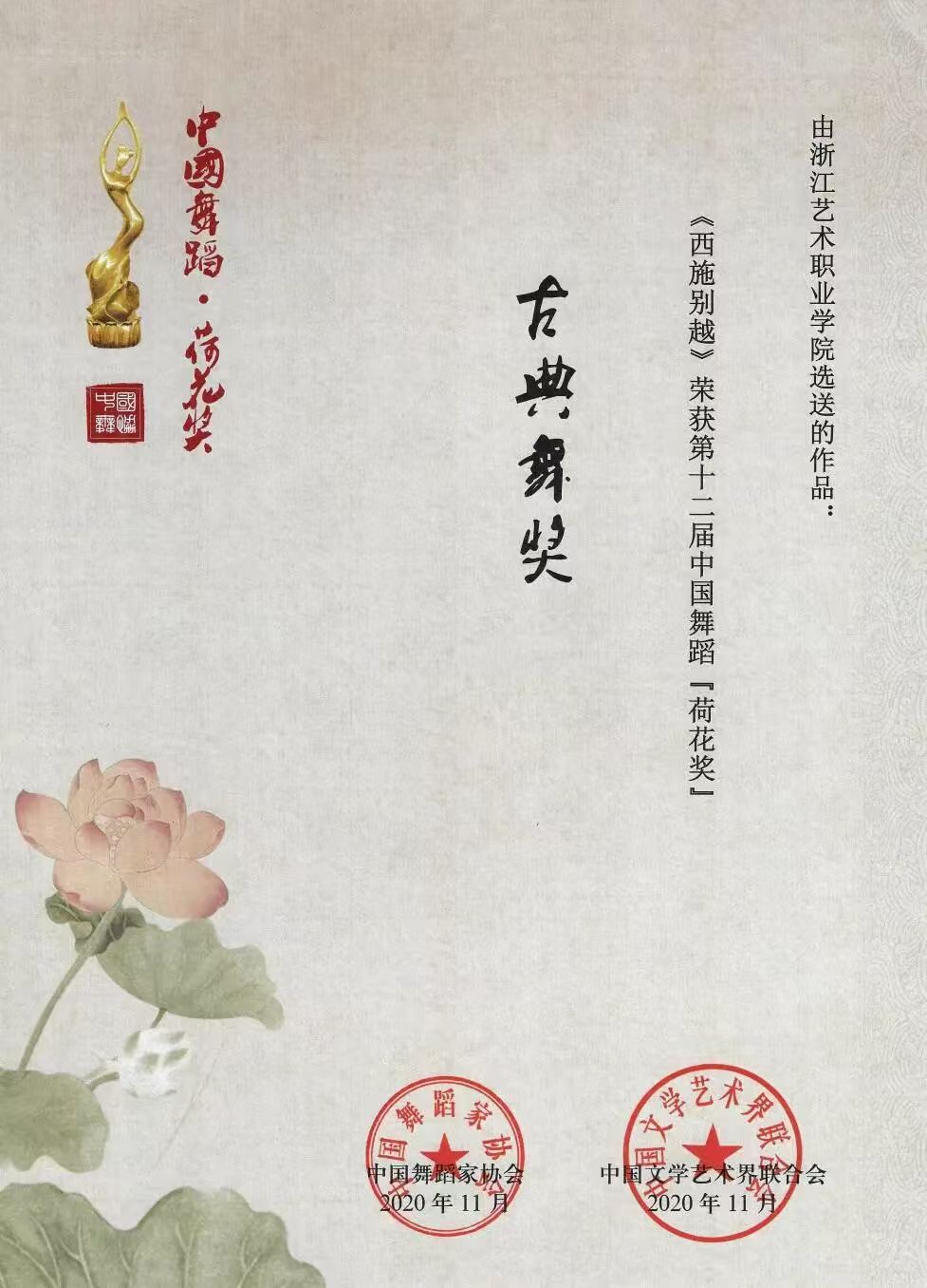原创作品《西施别越》荣获第十二届中国舞蹈“荷花奖”——古典舞奖