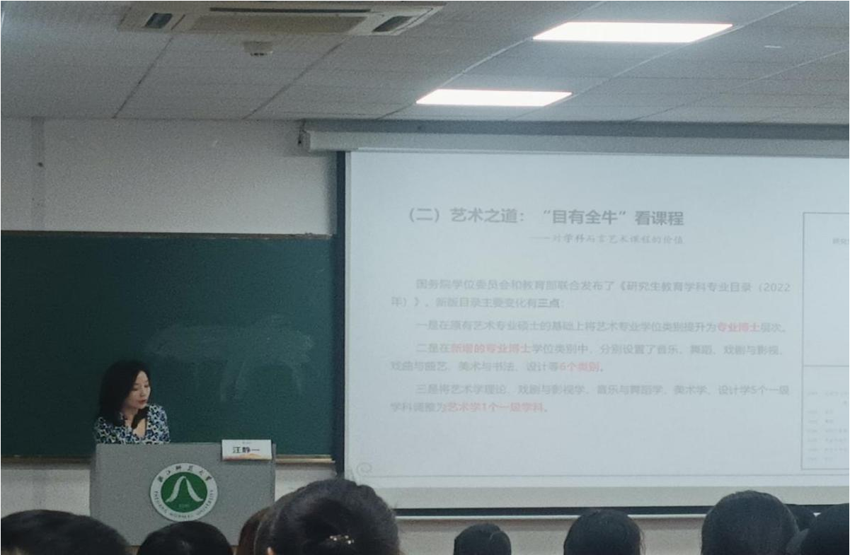 在互动环节,教师们积极提问,围绕“如何平衡教学进度与学生个性化发展”“怎样将新技术更好融入艺术课堂”等实际困惑求解,汪静一教授一一耐心解答,现场氛围热烈。此次讲座为教师们搭建了艺术教学知识体系,助力他们站在更高起点开启教育生涯。